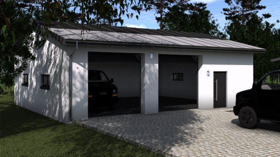 Projekt G025 to praktyczne i estetyczne rozwiązanie dla osób poszukujących prostego w budowie, a jednocześnie nowoczesnego garażu dla dwóch dużych samochodów z wygodnym zapleczem gospodarczym.