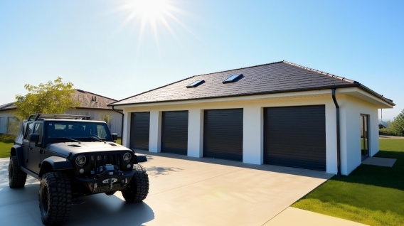 Na elewacji frontowej zaprojektowano cztery przestronne bramy garażowe o wymiarach 300 × 260 cm każda, zapewniające komfortowy wjazd również dla większych i wyższych pojazdów.