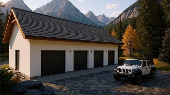 Garaż K323A to funkcjonalny, estetyczny i praktyczny obiekt, który spełni oczekiwania osób szukających komfortowego i przestronnego miejsca do parkowania lub przechowywania sprzętu w nowoczesnym stylu.